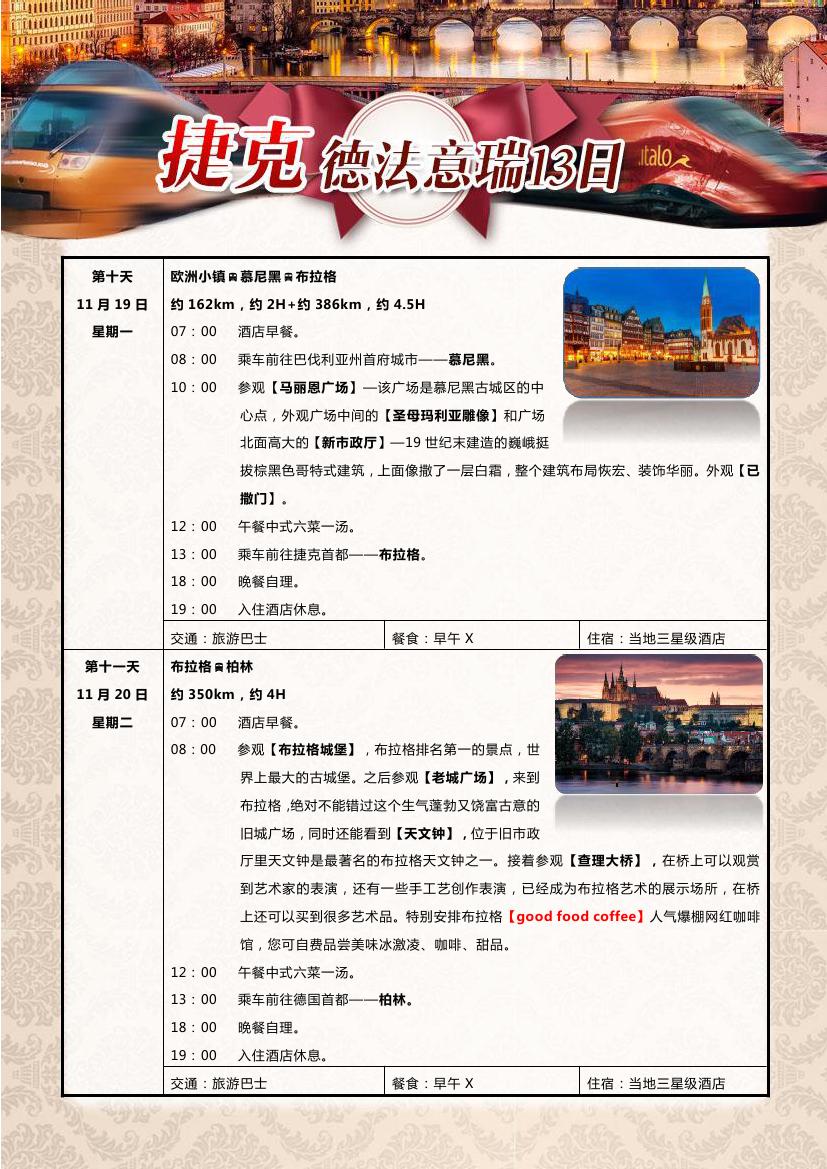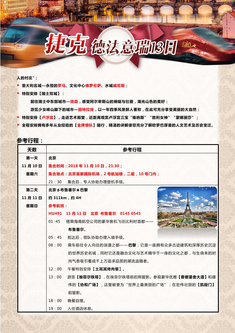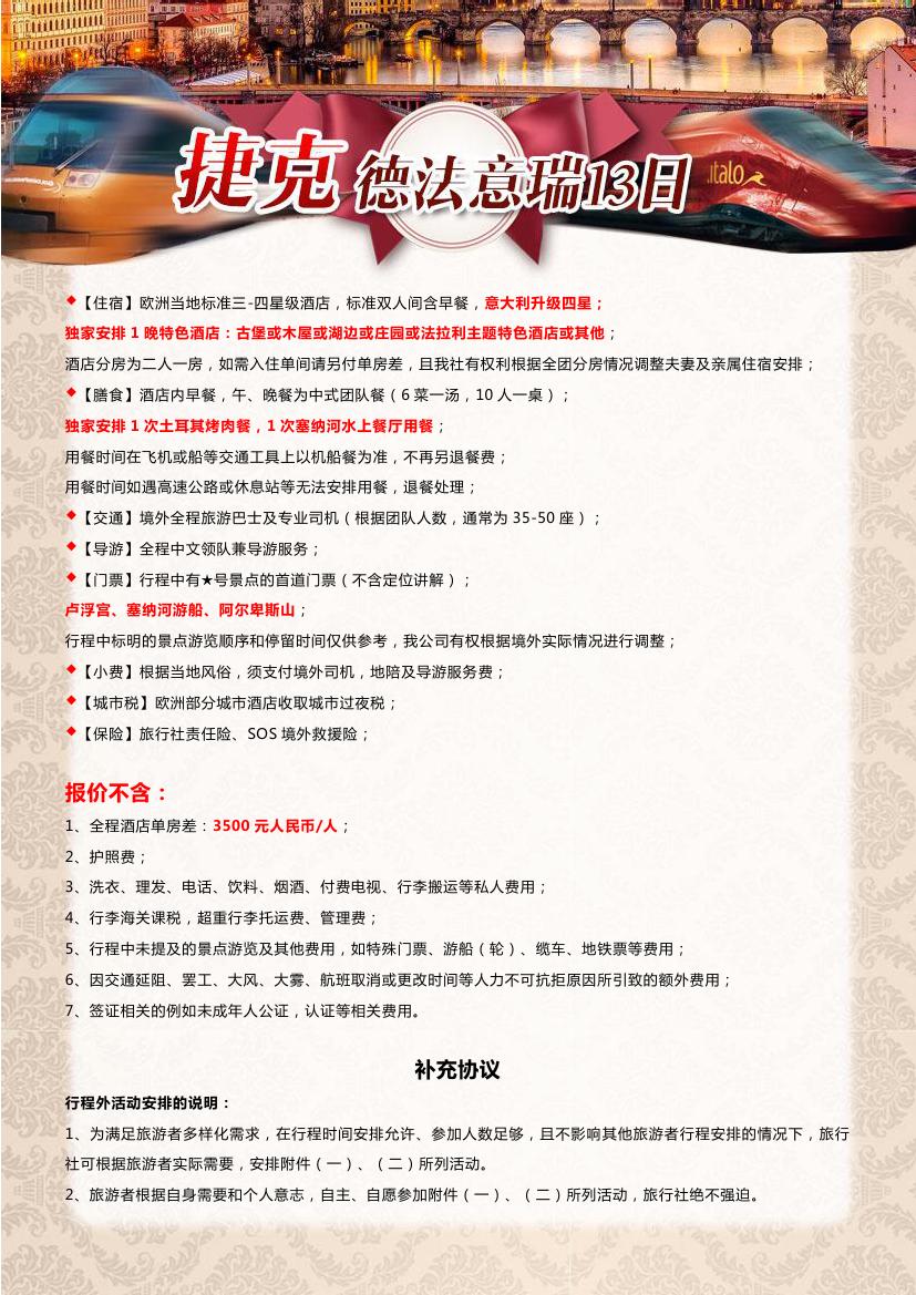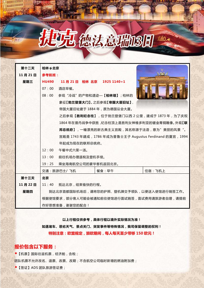 > 【超值一价全含】布拉格+德法瑞意五国13天10晚双飞跟团游—海航赠送呼市联运,24小时快签